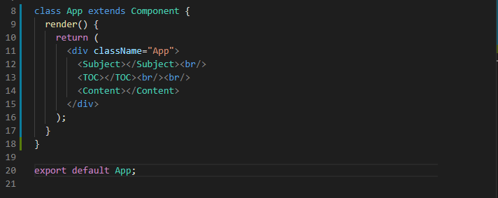 각각 App.js 화면에 표시할 간단한 컴포넌트들을 만들어 보았다. 세 개의 컴포넌트 Subject, TOC, Content를 작성하여 보았다. 이것을 이제 App.js 화면 안에 다같이 포함해서 사용해 볼 것이다.