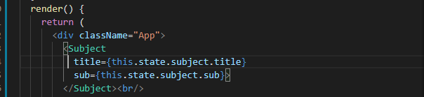 예를 들어 저번에 Web이라는 subject파일 안에 있는 정적인 값을 속성을 주어서 원하는 값으로 편하게 바꿀 수 있도록 하기 위해서는 props를 사용하는데, 수정 내용은 아래와 같이 원래 안에 내용이 들어갈 <h1> 태그 안에 {this.props.props명}을 써주는 것이다.