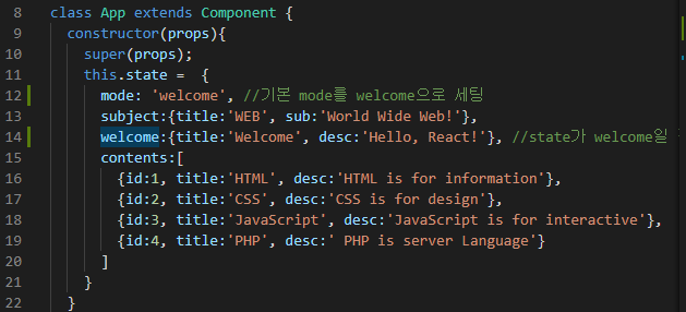 페이지에서 컴포넌트를 클릭했을 때, 각각 다른 내용이 나오게 하려면 그 눌린 것이 무엇인지 식별할 수 있어야 한다. 그래서 각각 mode라는 것을 세팅해주는데, 페이지의 기본 mode는 welcome으로 설정해주기로 하여 아래와 같이 state안에 mode를 추가하고, mode가 기본인 welcome일때 나오는 welcome의 title과 desc를 정의해주었다.