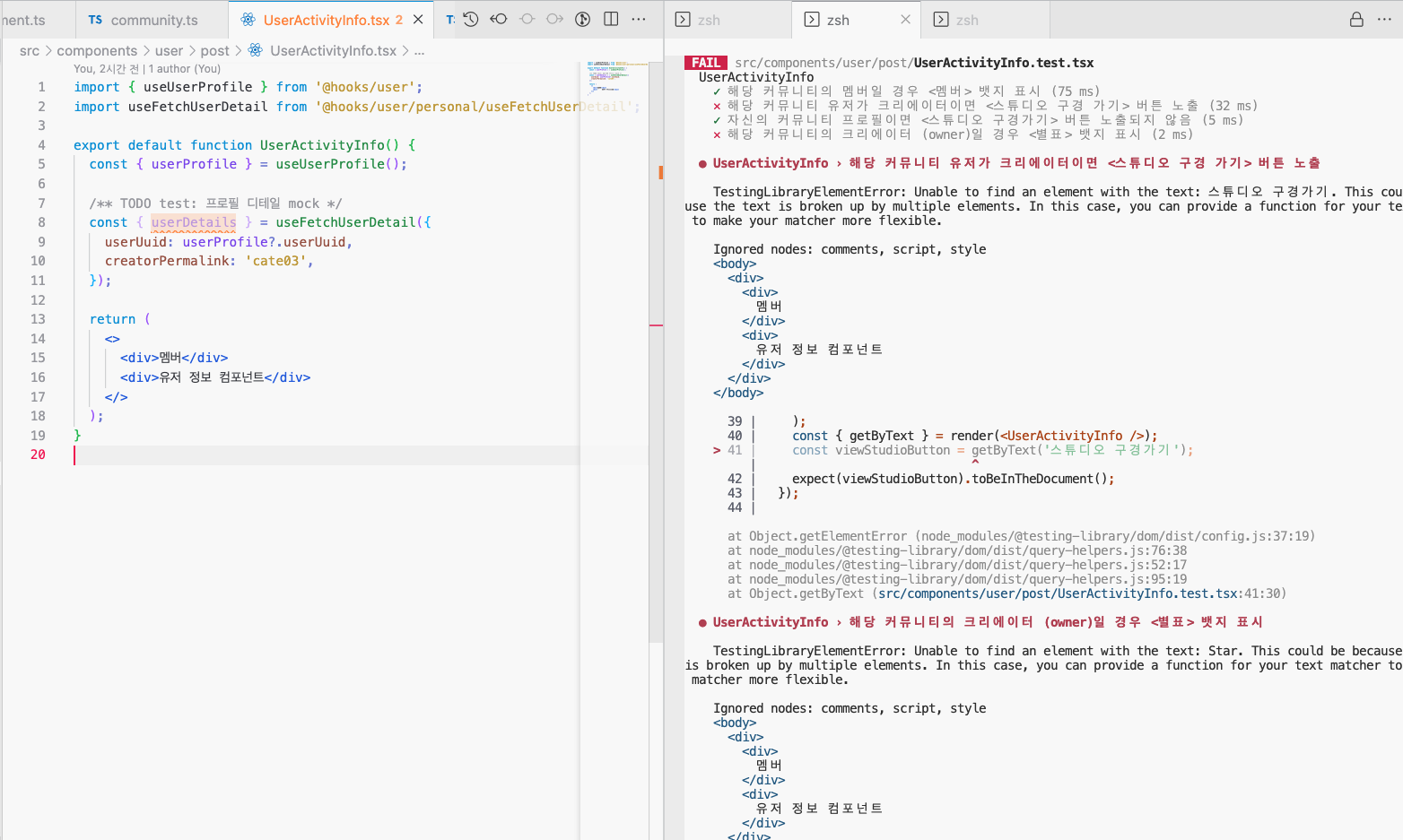 맡은 프로젝트에서 유저가 쓴 글들을 모아볼 수 있는 유저 페이지가 추가되어야 했다. 이 경우에 리스트 컴포넌트와 같은 경우에는 이미 이전에 쓰던 컴포넌트가 있었지만 유저 정보가 들어가 있는 컴포넌트는 새로 만들어야 했다. 게다가 이 유저 정보 컴포넌트는 크리에이터인지, 멤버인지, 소유자인지에 따라서 보여줘야 하는 방식에 대한 케이스가 다양했기 때문에 테스트를 도입하면 좋을 것 같다는 생각이 들었다.